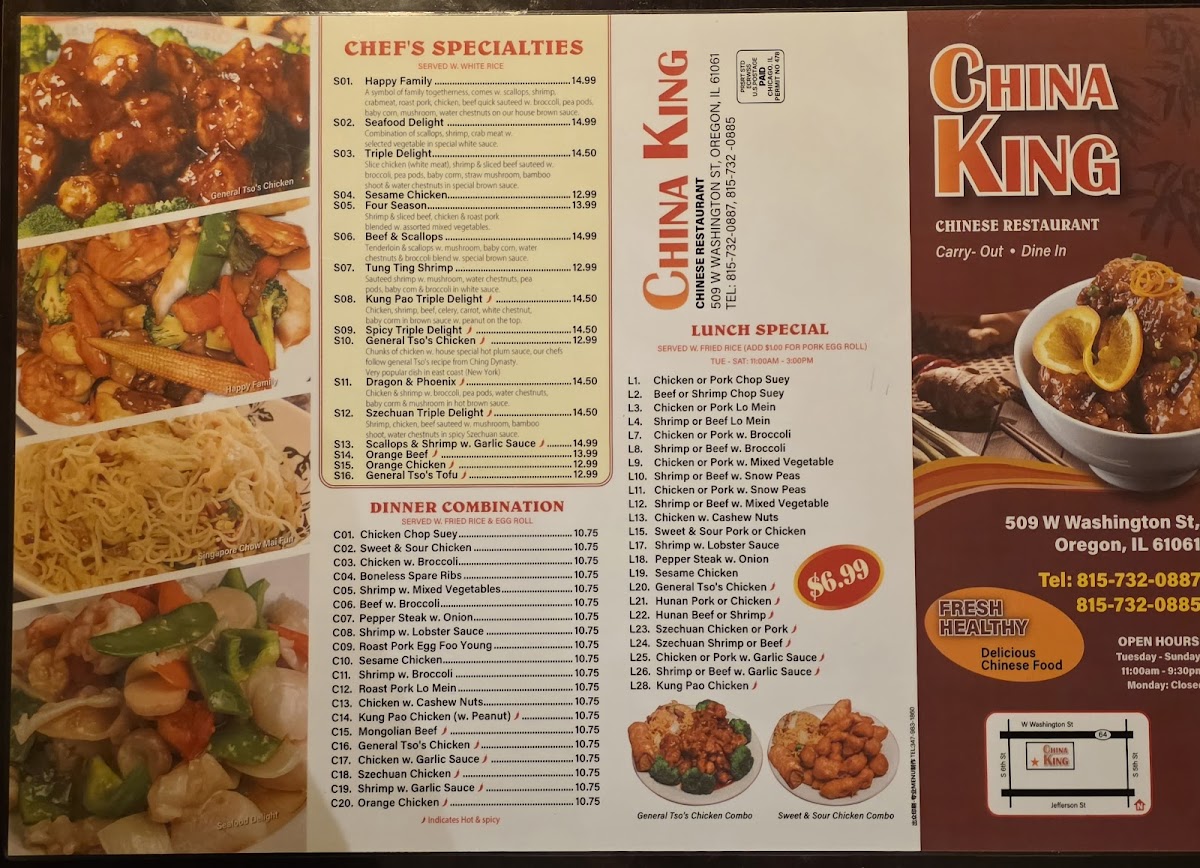 China King, located in Oregon, IL, offers a vibrant menu that captures the essence of classic Chinese cuisine with generous portions and well-balanced flavors. Their seafood selections, such as Shrimp with Broccoli, Kung Pao Shrimp, and Szechuan Shrimp, bring bold, savory notes that pair perfectly with fresh vegetables and authentic sauces. The pork dishes, including Roast Pork with Mixed Vegetables, are equally satisfying, delivering rich textures and hearty flavors.